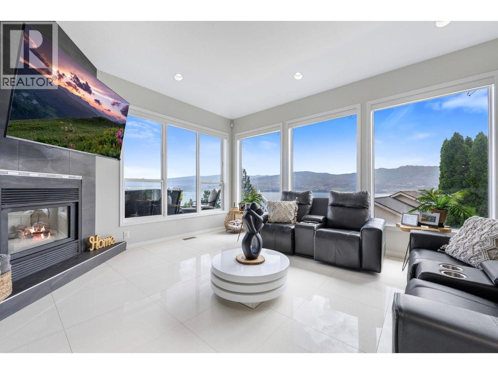 This is what living in the Okanagan is all about! Phenomenal lake views from this perch and definitely a must see! This 5 bedroom home is located steps from Mission Hill Winery and overlooking the vineyards and gorgeous Okanagan Lake, just off the Wine Trail in Lakeview Heights with 180 degree lake views from both levels! 16 foot ceilings on the main with contemporary finishings creating a sleek California feel. Gleaming white tile floors, island kitchen with stainless appliances, quartz counters, high-gloss and laminate cabinetry, all in a beautiful open plan. Easy living with laundry on the main, a spacious and luxurious primary suite with ensuite complete with makeup vanity and beverage fridge, heated floors and glass shower - don't miss the custom walk-in closet with built-in organizers too! Also a second bedroom with full bathroom (cheater ensuite) and murphy bed - great space for your at home office! Lower level has been recently renovated, complete with a 2 or 3 bed suite (depending what you needed) with walk-out covered patio. 9 foot ceilings in lower level with walk-out to patio and full wet bar/kitchen. A great entertaining home with stunning updates. (id:6289)