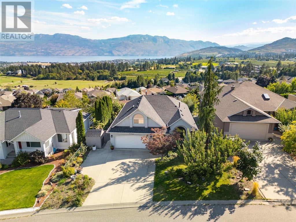 Welcome to a warm & inviting home perfectly positioned to capture panoramic lake, mountain, vineyard & valley views. Nestled in a private, family-oriented neighbourhood, this property offers the ideal blend of tranquility, convenience & breathtaking scenery. Natural light floods the main floor through large windows, framing lake views & lush greenery. Thoughtfully designed for comfortable main-level living, the layout features a formal living & dining area that flows into a bright, open-concept kitchen with quartz countertops, gas range & generous cabinetry. The dining nook overlooks the lake, while the adjoining sitting room opens to a deck with a power awning, gas hookup & unobstructed sightlines, ideal for morning coffee or evening entertaining. Wake up to lake views from the primary, complete with a full ensuite & walk-in closet. A second bedroom & full bathroom complete the main floor. Upstairs, a flexible loft-style room with a large window offers the perfect space for a bedroom, playroom or studio. The lower level includes a den, full bathroom & self-contained in-law suite with entrance-ideal for extended family or guests. The private backyard is a true sanctuary, featuring mature fruit & nut trees & space to relax. Known for excellent water quality from a well-respected local district. Located within easy reach of top-rated schools, beaches, parks, trails & more, this home offers a lifestyle opportunity in one of the most picturesque pockets of the Okanagan. (id:6289)