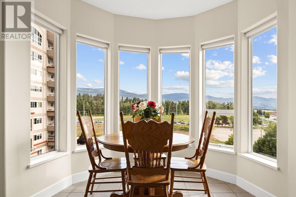 Welcome to Park Place! Enjoy this 5th floor one bedroom plus den (easily used as a 2nd bedroom) condo overlooking the park-like grounds and view of the mountains. Bright open spacious living room with gas fireplace, dining area, and a large kitchen with breakfast nook. Large primary bedroom with 5 piece ensuite featuring double sink vanity, bathtub and accessible walk thru shower. The den (2nd bedroom) includes direct access to the main bathroom, making it ideal for guests or office. With the complex offering a variety of amenities you feel like your home is a resort! Enjoy the outdoor pool and hot tub, tennis court, fitness room, a full cinema room, library, car wash, workshop and guest suite for only $30/night for your extra guests. Located just steps from Orchard Park Mall, Costco, Superstore, restaurants, and the Mission Creek Greenway—this location offers the perfect balance of lifestyle and accessibility. Strata $543.58/month (includes gas, sewer, water, recreation facilities). Pet-friendly policy (1 small dog or cat) allowing either one dog (up to 15"" at the shoulder) or one cat. (id:6289)