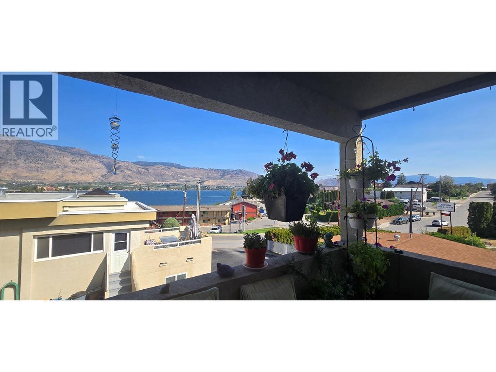This top-level townhome offers exceptional features including lake views, walking distance to the beach and downtown, and a covered deck overlooking the lake. The unit comprises two bedrooms plus a den, an open-concept floor plan ideal for hosting guests, and a patio with views of both the lake and a charming courtyard featuring a communal covered dining area and tranquil fountain. Amenities include a cosy gas fireplace, easy-care tile and laminate flooring, covered carport parking, and a storage locker. Conveniently located across from the beach and within short walking distance to all local amenities, this well-managed complex consists of only seven units. Enjoy the finest of Okanagan living: premier golfing, fine dining, water sports & award winning wineries. 55plus complex, pets welcome with restrictions. Measurements are approximate and should be independently verified if important (id:6289)