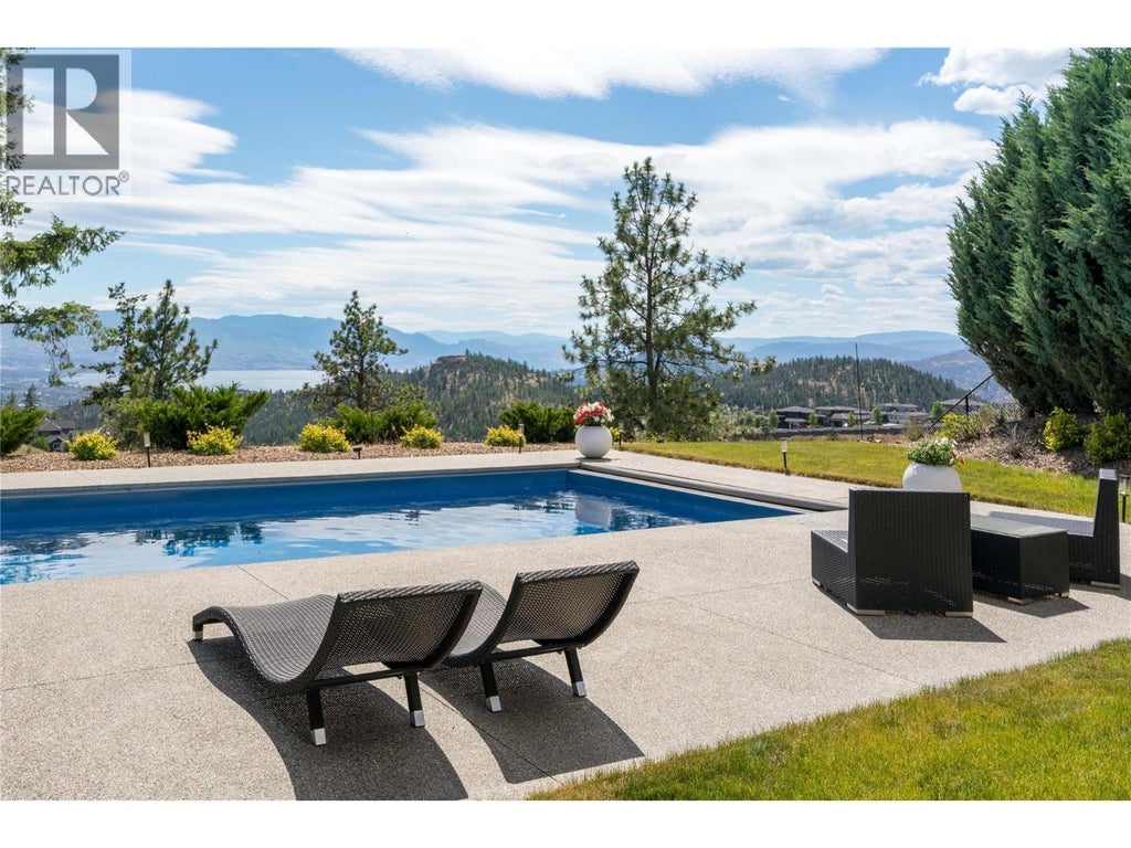 Completely renovated from top to bottom, this breathtaking residence embodies refined living in Wilden—Kelowna’s most coveted enclave. The striking modern exterior with crisp white & black accents makes a bold statement, setting the stage for the exceptional design inside. Expansive windows frame captivating lake & mountain views, while soaring ceilings & a stunning floor-to-ceiling fireplace create a grand yet inviting atmosphere. The designer kitchen is a showpiece, featuring a massive Dekton island, 6-burner Thermador range, butler’s pantry, beverage centre & seamless flow to the covered deck—ideal for entertaining. Upstairs, the primary suite is a private sanctuary with sweeping views & an ensuite that rivals a luxury spa, complete with heated floors & a double rain shower. Two additional bedrooms & a full bath complete the upper floor. The lower level offers ultimate versatility with engineered hardwood: an elegant family lounge, custom wine cellar, gym space, guest bedroom & a bathroom with direct access to the outdoor retreat. Step outside to the saltwater pool with auto cover, hot tub & multiple lounging areas—surrounded by protected green space for unparalleled privacy. Notable features include real hardwood throughout the rest of the home, a 3-zone furnace, 240V EV-ready 3-car garage, electric window coverings, UV-filtering windows & solid 8ft doors. A true legacy home—where sophisticated design meets everyday comfort in an irreplaceable setting. (id:6289)