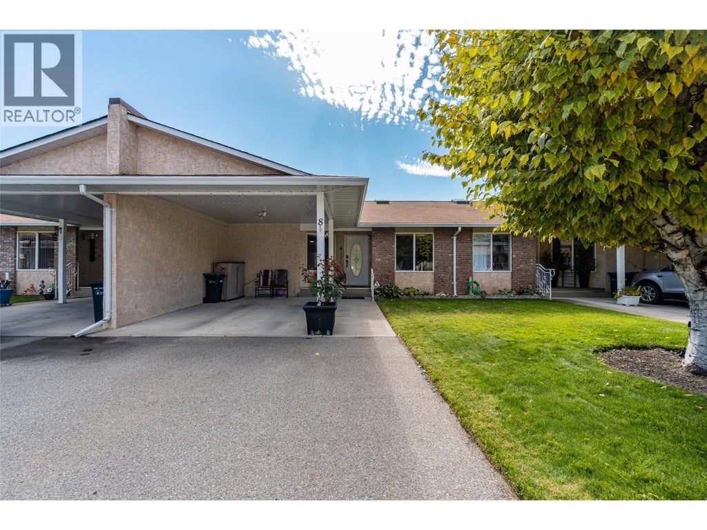 Welcome to this charming one-level townhome set in a quiet neighbourhood along the Okanagan river. Lovingly maintained by the same owner for 30 years, this home is move-in ready & perfect for all ages. Inside you will find bright, open space with lots of natural light. The kitchen offers plenty of cupboard space including a pantry, with gleaming white appliances & a new microwave. The open concept dining & living area feature modern vinyl flooring throughout, with a solar tube providing additional natural light. Primary suite has a large window, walk-in closet & convenient 2-pce bath with built-in storage. Spacious main bathroom shines with a walk-in shower & skylight. Second bedroom has a large, bright window overlooking the picturesque front yard, making it an ideal office or hobby room. Full-size washer & dryer are tucked away & only 3 yrs old. When you want to spend time outdoors, step out onto your private, covered patio with a storage shed. The patio and cover have been extended to offer extra space to relax, unwind, enjoy some green space & take in the beautiful views. An added bonus is the huge, full-size 6 ft high crawl space that has been partially turned into a WORKSHOP, plus tons of extra storage space. For peace of mind you will find a newer heat pump, hot water tank, water softener & reverse osmosis. Covered parking out your front door & RV parking available. No age restrictions here, 2 pets permitted. Strata fees $363/month cover maintenance & landscaping. (id:6289)