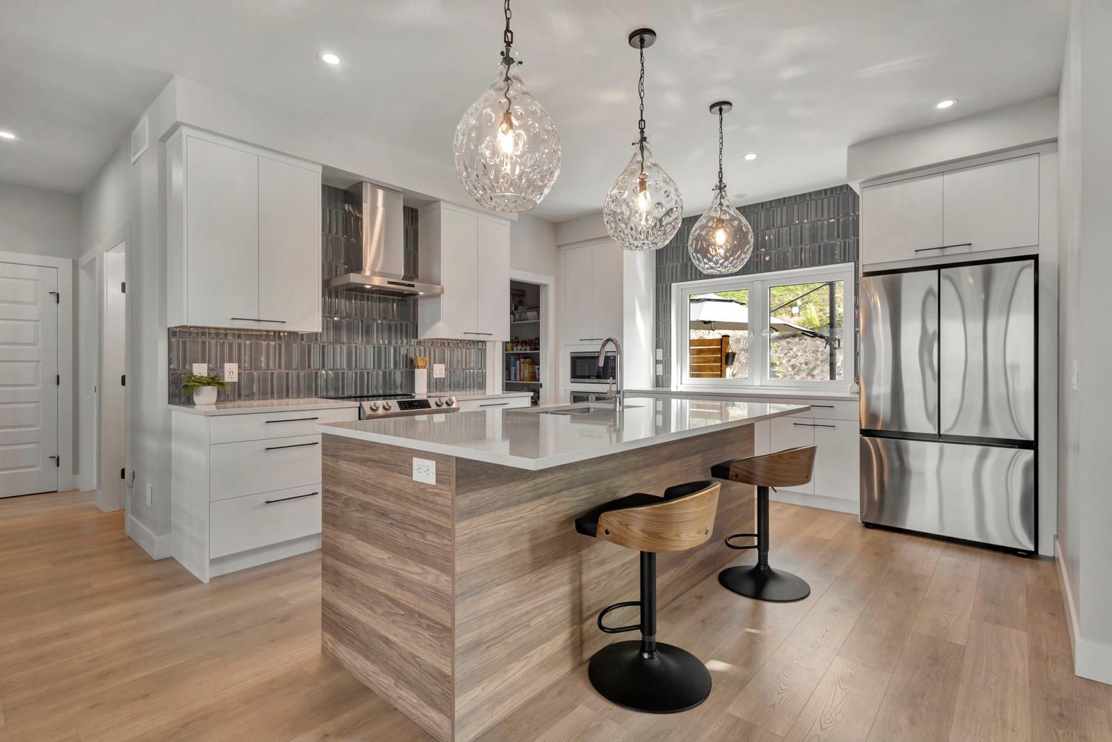 Outstanding VALUE! Last-Chance Luxury in The Ponds — Former Carrington Showhome (NO GST!) Perched above the city in one of Kelowna’s most desirable communities, this incredible home delivers luxury, lifestyle, and location in one stunning package. With over $100,000 in upgrades, this 3-bed, 3-bath walk-up is better than new—designed to impress with custom features and breathtaking mountain and skyline views. The open-concept main floor is built for entertaining, featuring a chef-inspired kitchen with quartz counters, premium appliances, walk-in pantry, and pass-through window to an outdoor sit-up bar. A sleek wine display anchors the living space, flowing seamlessly to a spacious front deck with glass railing and remote blinds. A rear patio and private backyard complete the indoor-outdoor experience. Upgrades include full-height tile backsplashes, custom built-ins, designer lighting, feature walls, and smart home integration. The primary suite is a retreat with dual vanity, tiled shower, and walk-in closet. Downstairs offers a large rec room, third bedroom, and full bath—perfect for guests, teens, or a home office. Set on a fully landscaped lot with underground irrigation, a tranquil water feature, and a rare 3-car garage (double + tandem), this home delivers unbeatable value in a move-in ready package. Located just minutes from top-rated schools, hiking trails, and the convenience of Mission Village. This is a rare chance to own a professionally designed, showhome-quality residence in The Ponds. Own NEW with NO GST! Don’t miss your chance—this one’s a showstopper!