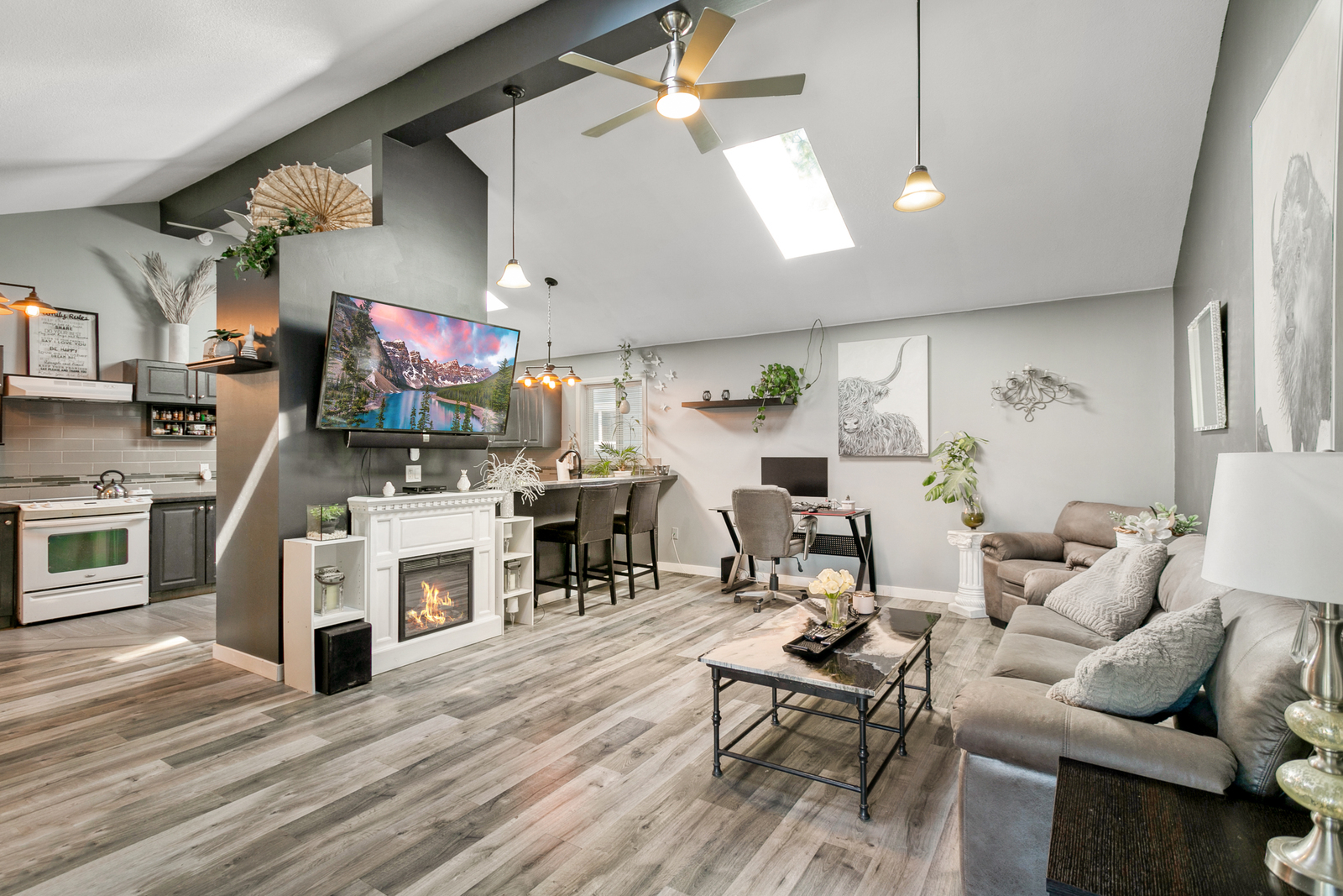 Discover the perfect blend of space + warmth in this stunning 3-bed, 2-bath modular home w/ a solid concrete foundation. Revel in the expansive rooms, thanks to skylights + vaulted ceilings. Enjoy open-concept living that brings everyone together. Children's laughter will echo in the custom bunk bedroom, complete with a tree fort-style cubby - a personal playground that promises endless joy. Unwind in the spacious primary suite, w/ a cozy natural gas fireplace + a luxurious en-suite, while the main bath boasts a generous shower w/ body jets + a beautifully tiled tub. Host gatherings w/ ease in your large, sleek kitchen equipped w/ SS appliances. Step outside to a private, fenced yard - perfect for children, pets, + backyard get-togethers. 2 attached sheds ready for your hobbies or storage needs. Covered deck w/ 8-person hot tub promises relaxation and privacy. Lots of parking and located at the quiet end of the community. Don't miss this rare, unique gem! Act quickly before it's gone!